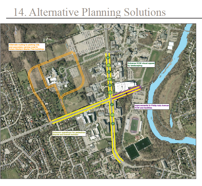 You will see that the study is evaluating as one possibility, diverting traffic from the west end of the Springett Parking lot through the neighbourhood to relieve the traffic at the Sarnia/Western Road intersection thru by-passing the intersection. This could also include a new traffic light between Western and Sleightholme. It could also increase cut through traffic from the University to Wonderland. Nothing decided at this point, you should be aware that this process is underway so that you might submit comments (see the last page of the attached which indicates the due date for comments and where to send them). Also under consideration is a double left turn for westbound traffic from Western Road.