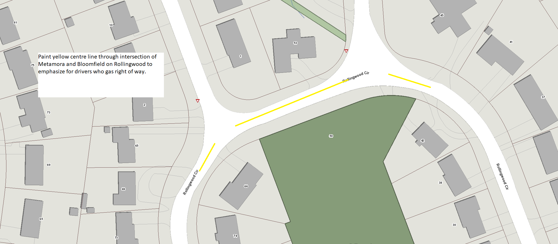 2. Pavement markings (a yellow centre line) will be added to Rollingwood/Metamora to further clarify who has right of way through the intersection.