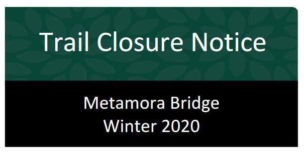 You may have seen a Trail Closure notice at the Metamora bridge in the Medway. We have already indicated to the city staff involved that the community supports repairing the bridge. However, because the bridge has been deemed structurally unstable, the City is required to close approaches to the bridge. We have been told that the area shown on the map that is closed includes the entrance to the Valley that is behind the Monastery because the City cannot direct users to private properties.