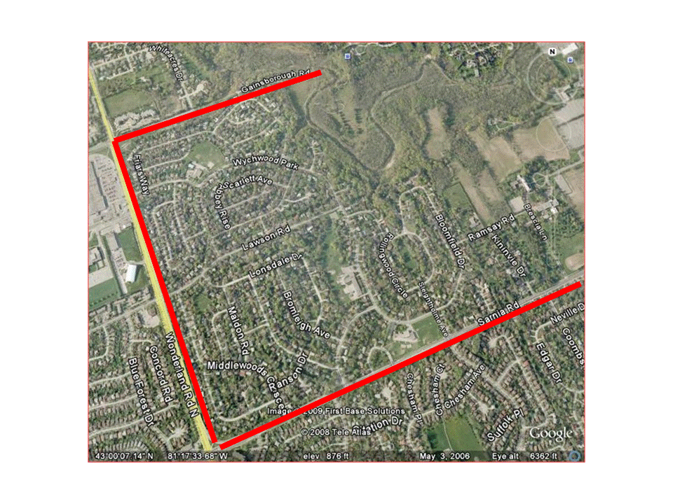 The neighbourhood is approximately bounded on the west by Wonderland Road, Sarnia Road on the South, Gainsborough Road to the North, and the University of Western Ontario and the Medway Valley on the east.